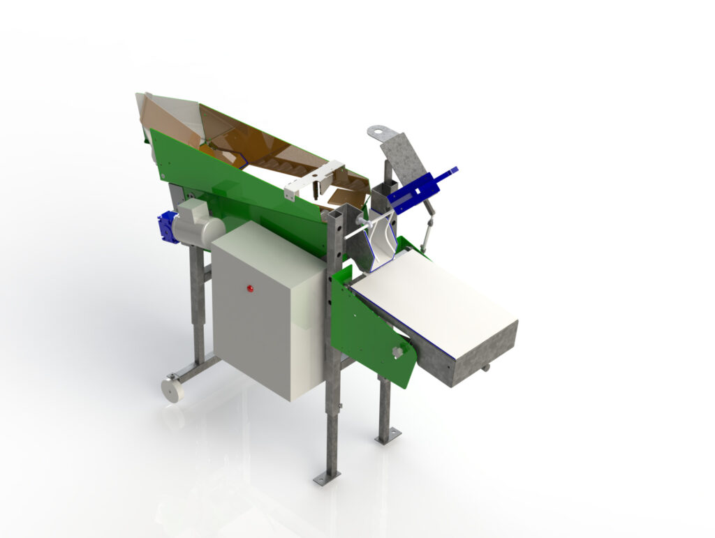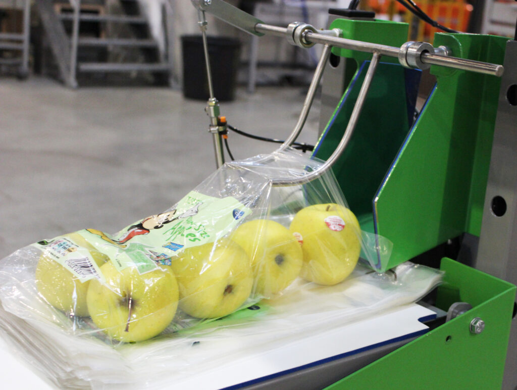 Installation is straightforward, adapting to either a 3-belt conveyor or the end of the conveyor, depending on the model. The bag opens automatically using air, fruits are gently loaded, and the cycle resumes automatically with minimal operator intervention, who only needs to tie and seal with tape.